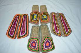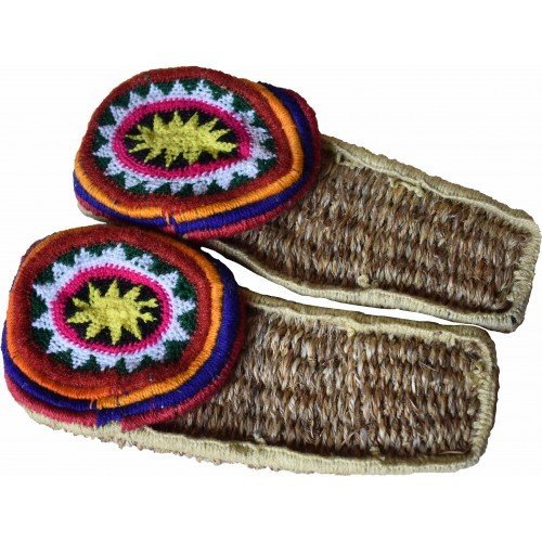 Pullas are grass shoes which are used as footwear. Grass has been Twisted into a rope and then topped it with a Wool thread upper. This footwear is made out of fibers procured from the bark of a wild bush, Bhaang (Hemp fiber). The upper portion of pullas is made of sheep wool and is decorated with colorful designs using threads while the bottom of footwear is made of Bang fiber. These Shoes are considered lightweight and warm & are preferred for acupressure effects. You can use them as slip ons for the house.
