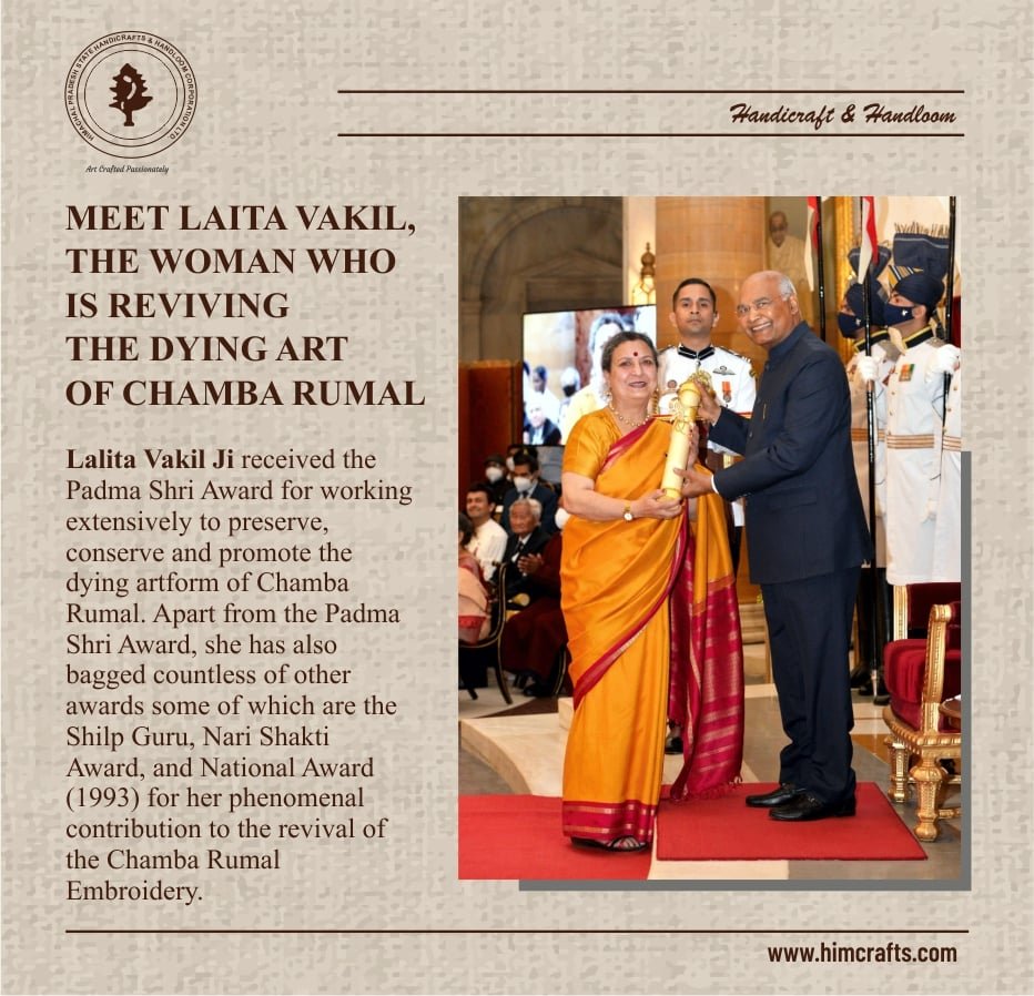 In the majestic hills of Himachal Pradesh lies a centuries-old art form—Chamba Rumal embroidery—renowned for its elegance, precision, and storytelling. Once at the brink of extinction, this intricate craft has found new life, thanks to the tireless efforts of Lalita Vakil Ji, a true custodian of Indian heritage. Her extraordinary contribution to reviving Chamba Rumal has earned her the Padma Shri Award, along with numerous other accolades.
